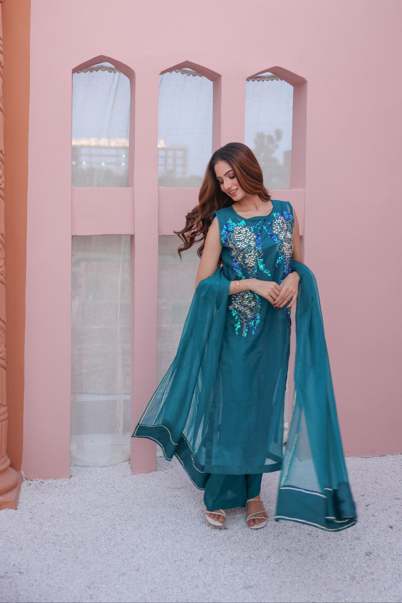 This outfit is absolutely stunning. The muse work on the shirt is intricate and gives a very refined, artistic look. The Swarovski work on the dupatta adds just the right amount of sparkle without being overpowering. The overall finishing feels premium and well-crafted. I’m truly impressed and very happy with the purchase. Highly recommended.